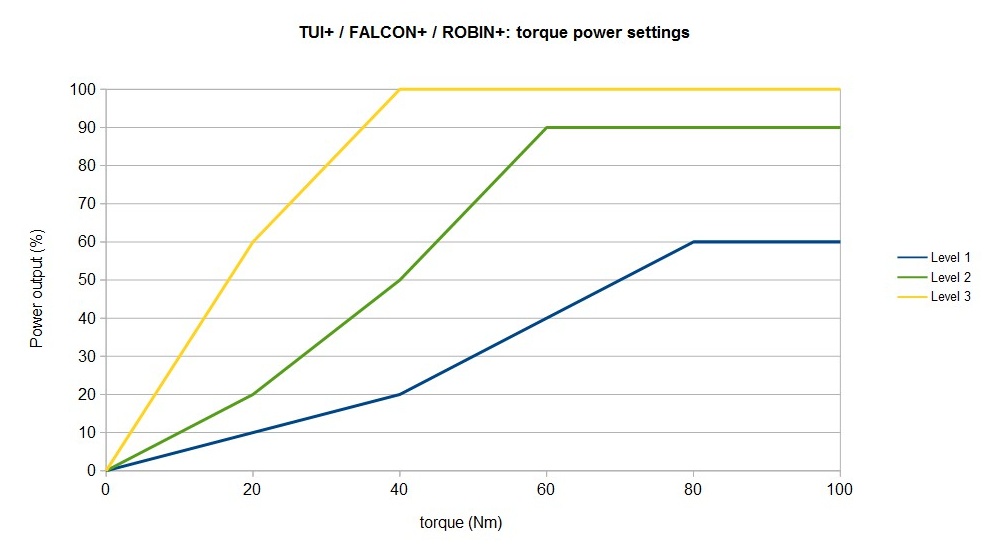 Torque = the force that the driver pushes into the pedals. I.e. In level 1 it starts gently, if the driver pushes harder (>40 Nm), more power is applied, but only up to 50% of the 300 W that the motor can deliver. While in level 2 the torque range is slightly smaller to provide up to 90% of the motor’s power, in level 3 the driver can achieve 100% motor power with even less effort.